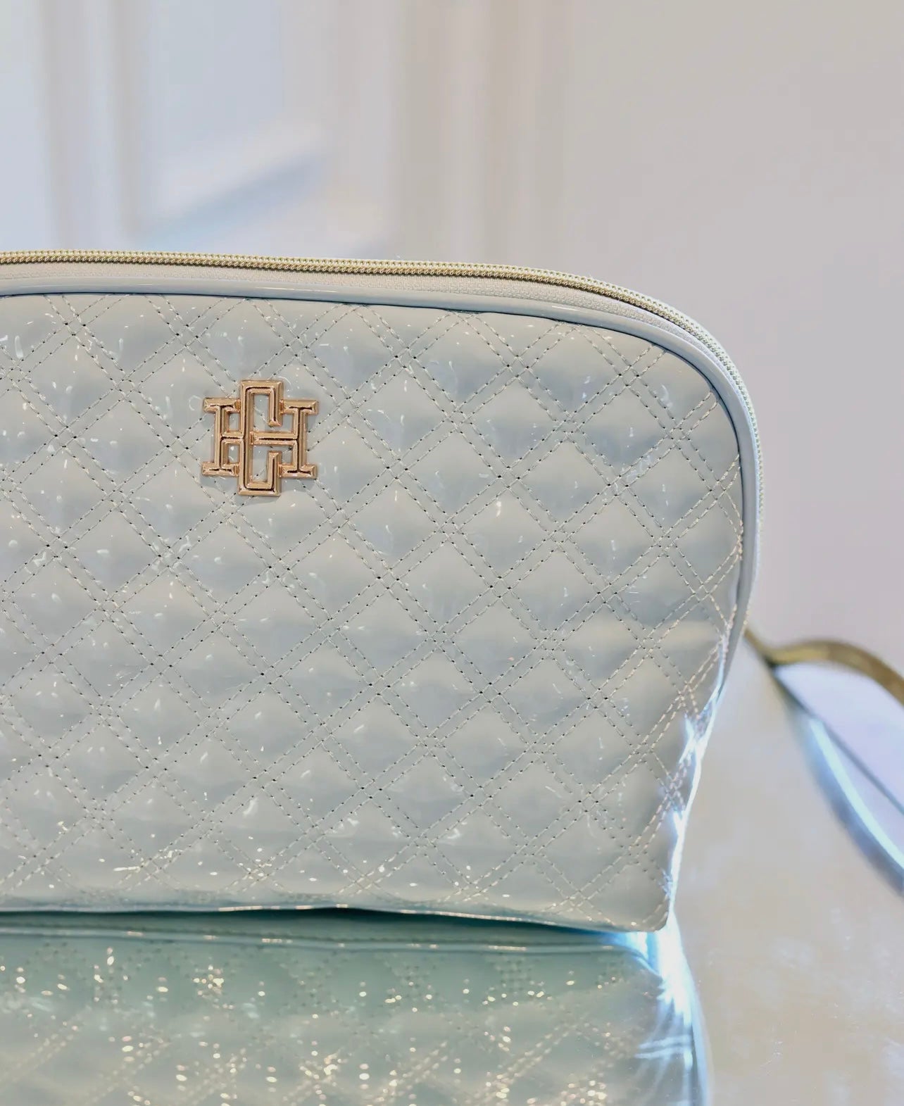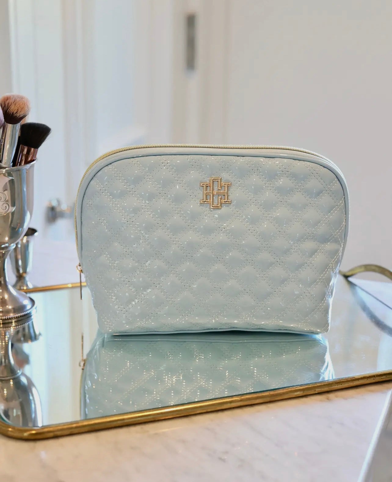 This beautiful vegan patent leather pouch is part of our makeup and travel collection and features a stylish quilted fabric design. The elongated zipper provides easy access, making it perfect for organizing makeup, toiletries, and hair accessories. The spacious interior is lined with nude fabric with a clear protective fabric that is easily wipeable. It also has mesh pockets to keep cosmetics neatly stored and accessible.