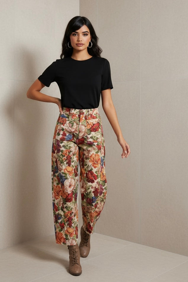 Bring a touch of artistry to your boutique with these tapestry cargo style pants. . Designed with a relaxed silhouette, elastic waistband, and practical side pockets, they blend everyday comfort with statement style. Perfect for versatile styling, adds charm and unique detail to any collection.