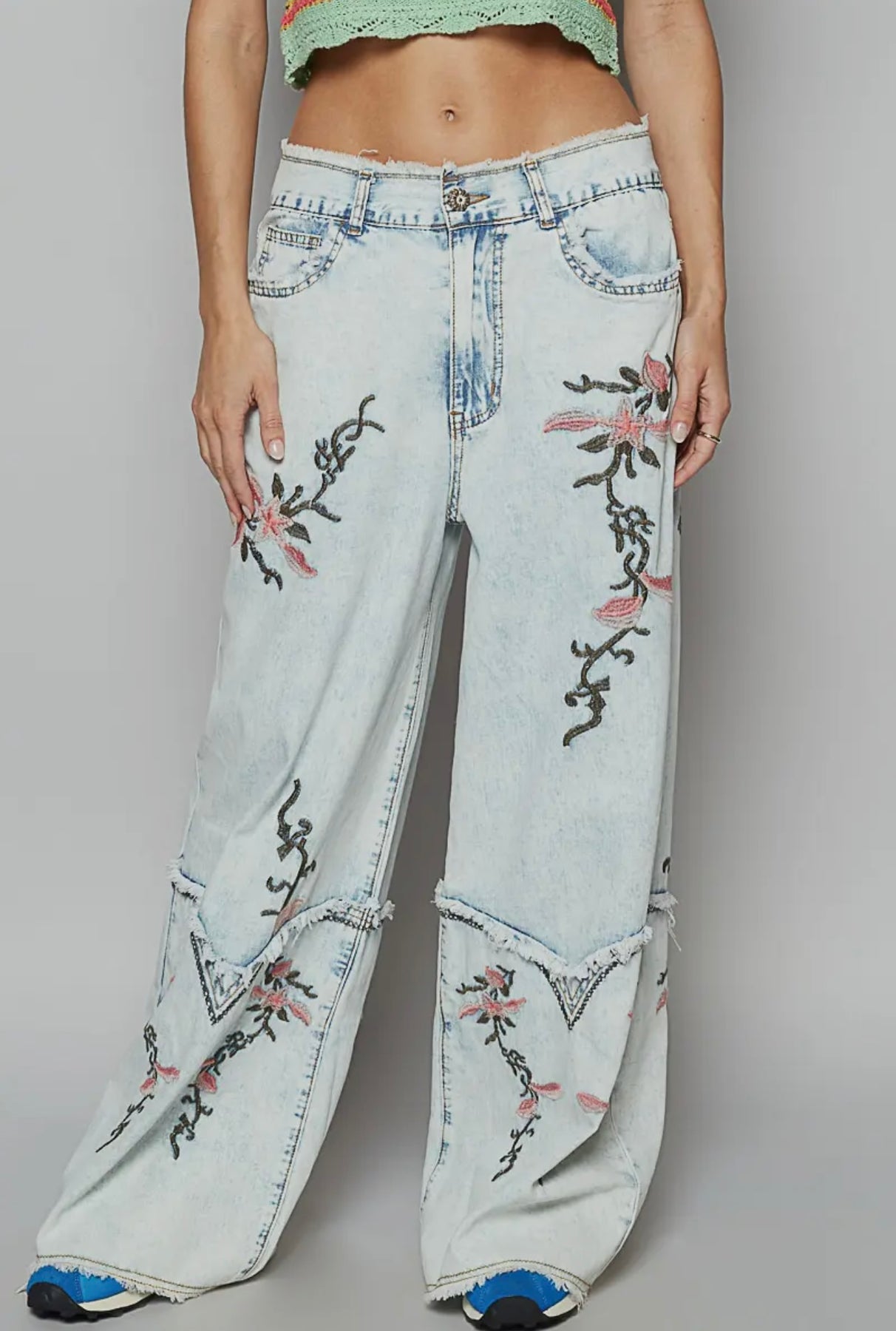 Loose oversized fit pants in a twill cotton fabric . Has a Western-inspired look featuring floral pink embroidery detail throughout. A truly unique item to add to your wardrobe!
