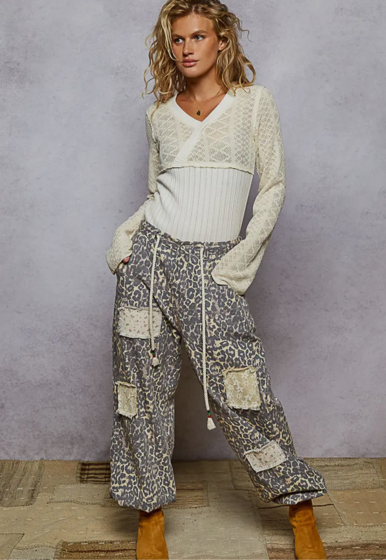 Crafted in printed twill, these roomy fit bottoms feature a mix of varied lace and woven patchwork for a unique, handcrafted look. Finished with an accented drawstring at the waist, they combine comfort with standout style, perfect for everyday streetwear.