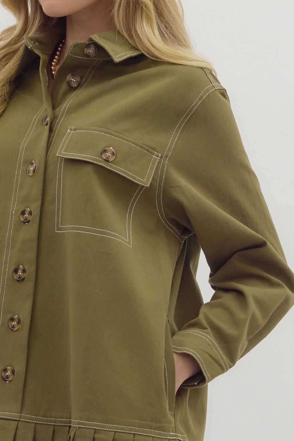 Solid long shirt sleeve pleated ruffle hem collar button closure mini dress featuring contrast accent stitch detailing. Side pockets. Unlined. Woven. Non-sheer. Lightweight.