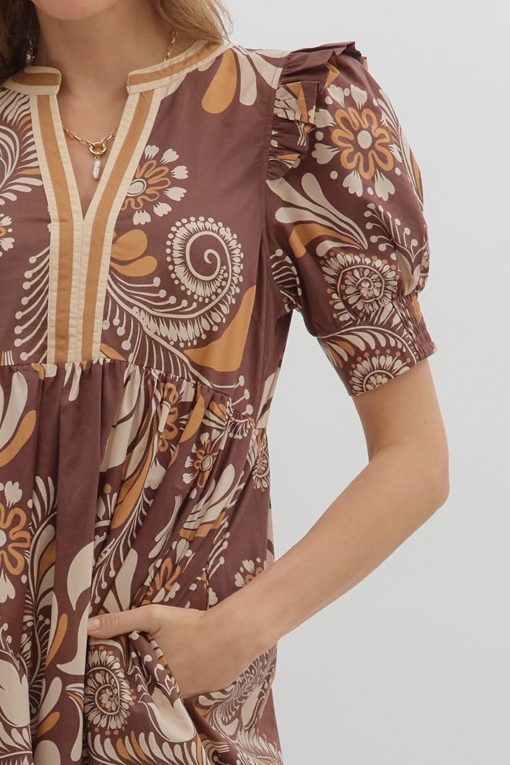 Paisley pattern smocked cuff band short sleeve tiered midi dress featuring multicolor V-neck band collar. Side Pockets. Lined. Woven. Non-sheer. Lightweight.