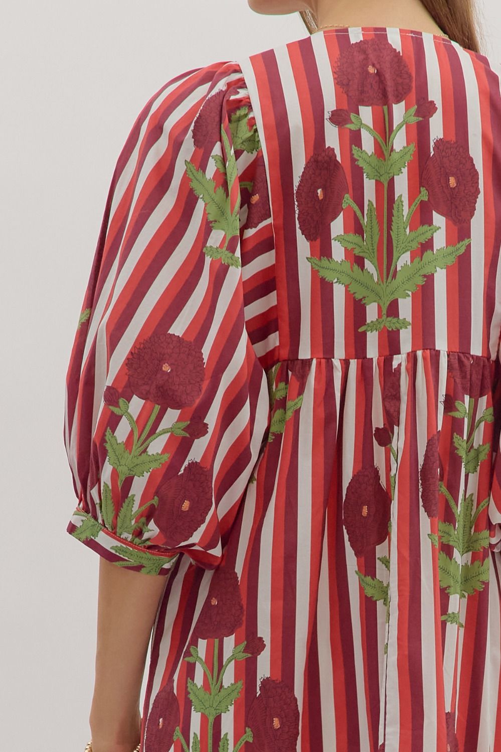 Striped puff sleeve midi dress with allover floral print. Split neck with tassel ties and partial button placket. Side pockets. Lined. Woven. Non-sheer. Lightweight.