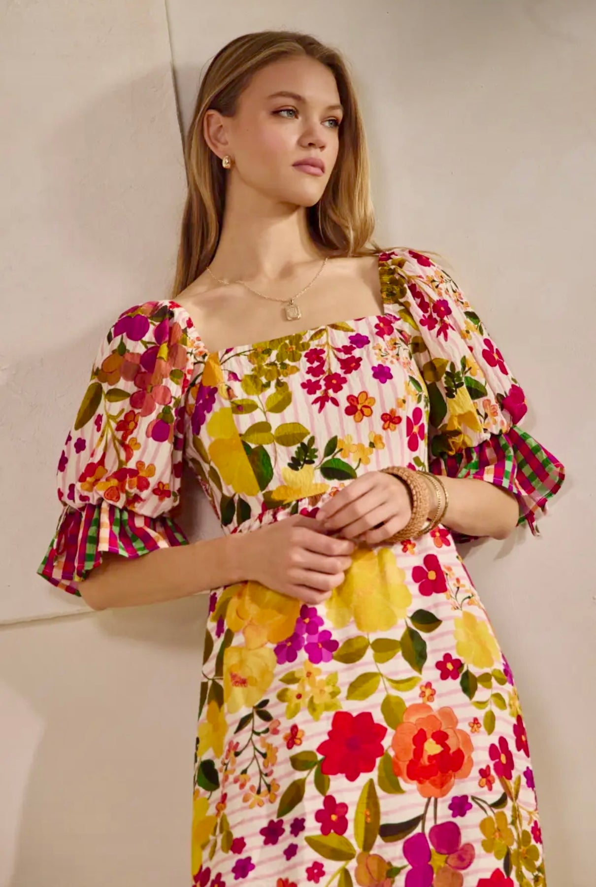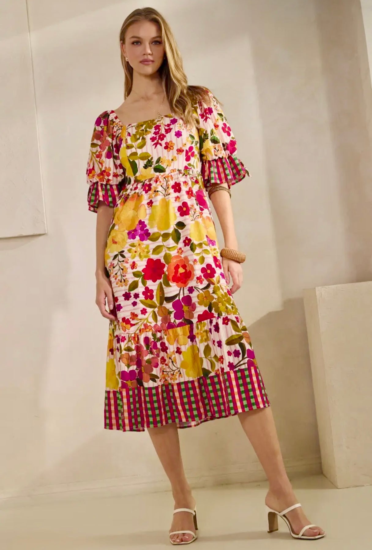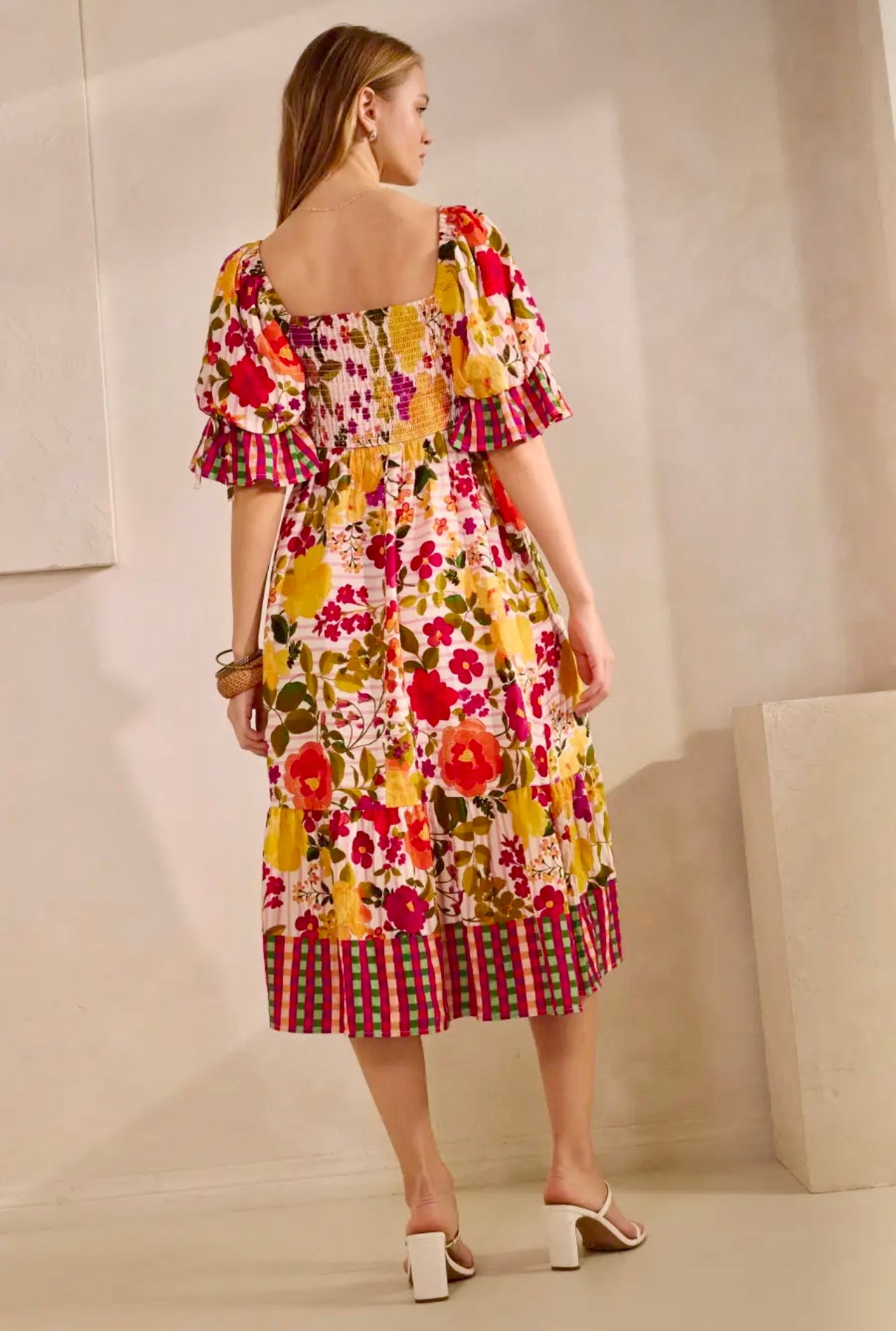 Floral border printed midi dress with a short bubble ruffled sleeve with smocked back.