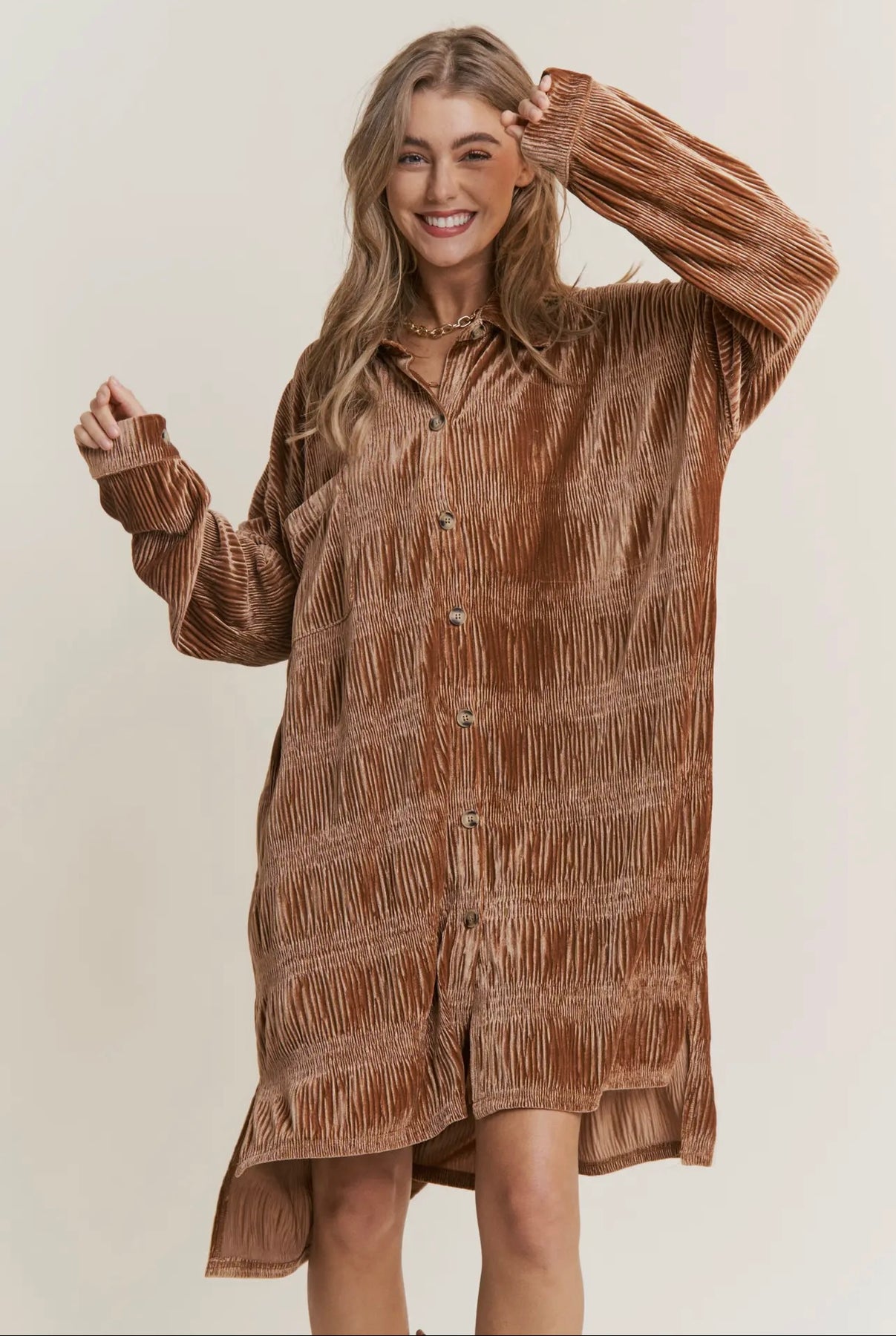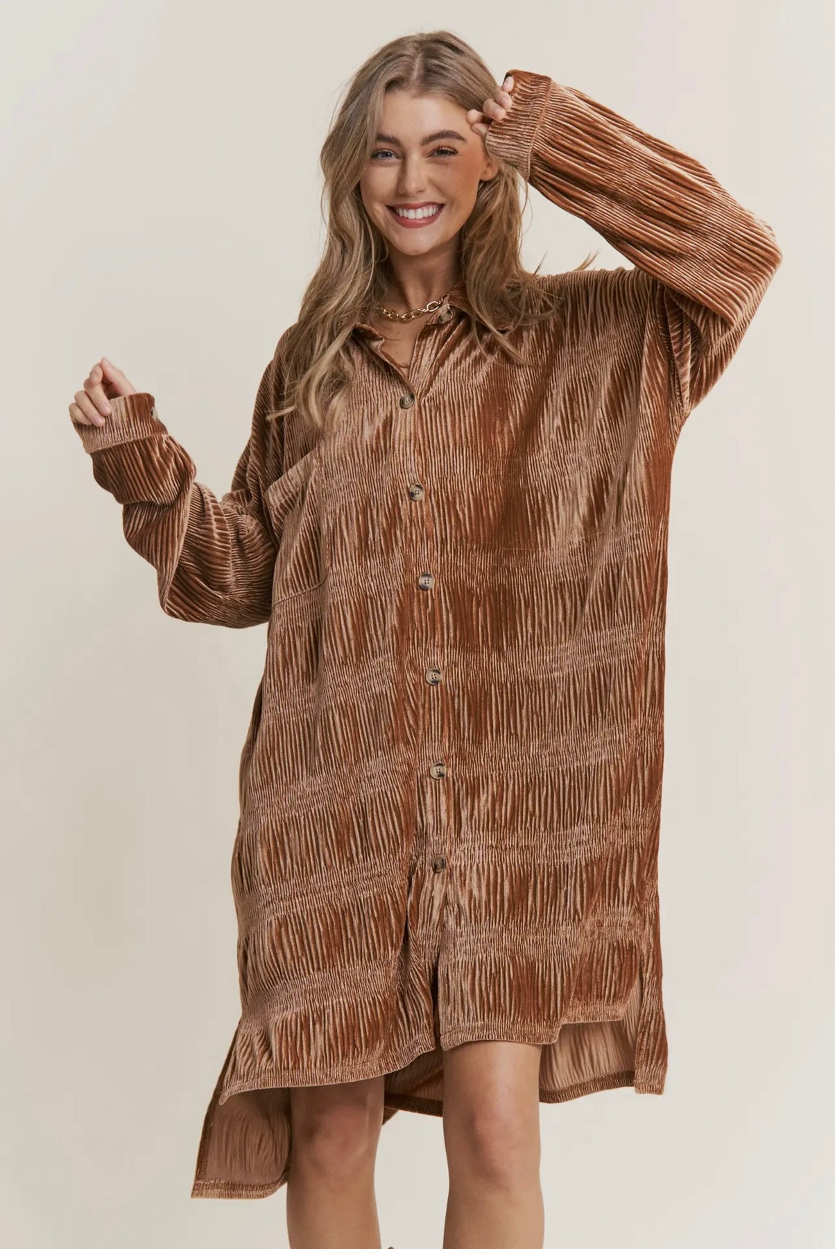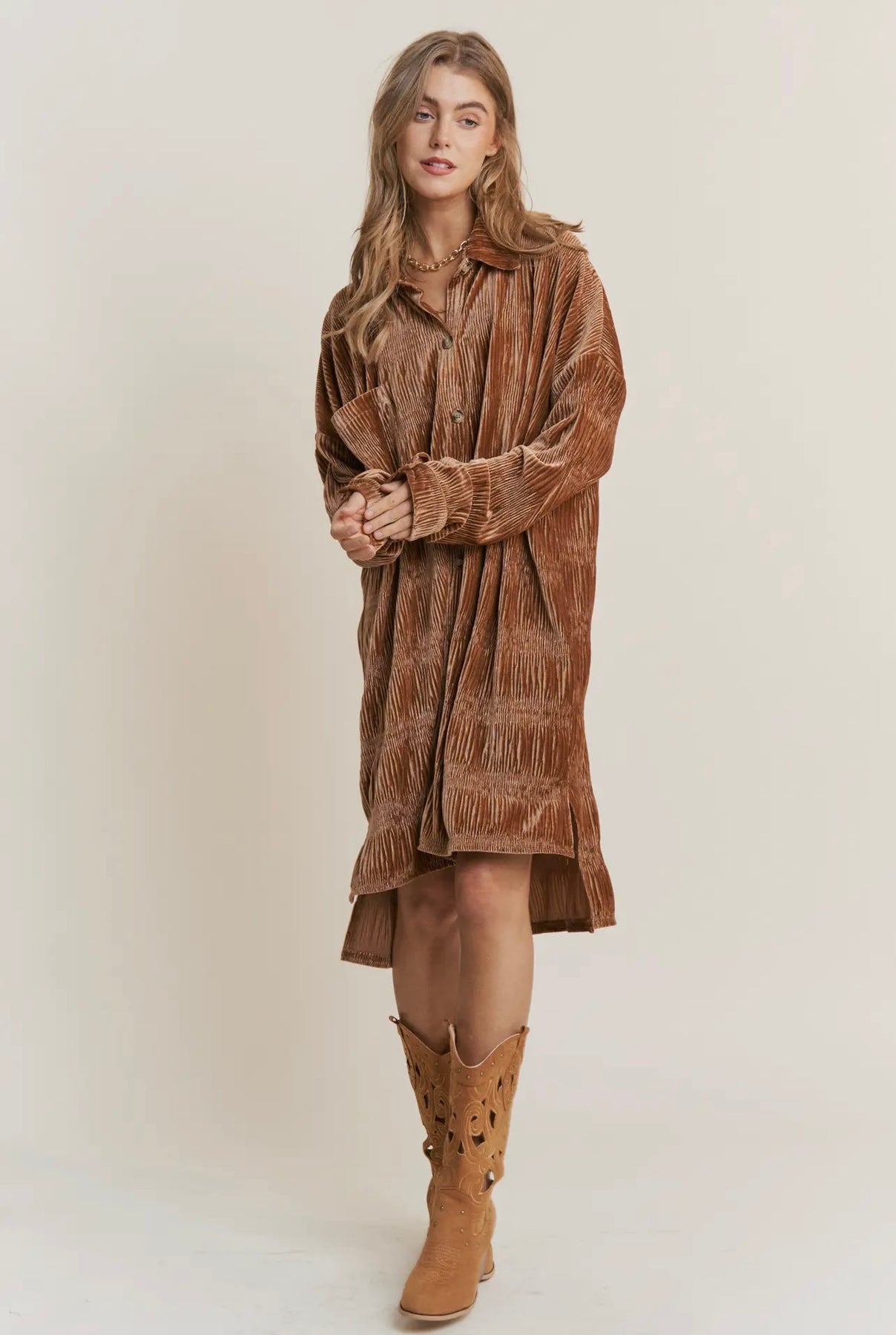 BUTTON DOWN VELVET SHIRT DRESS