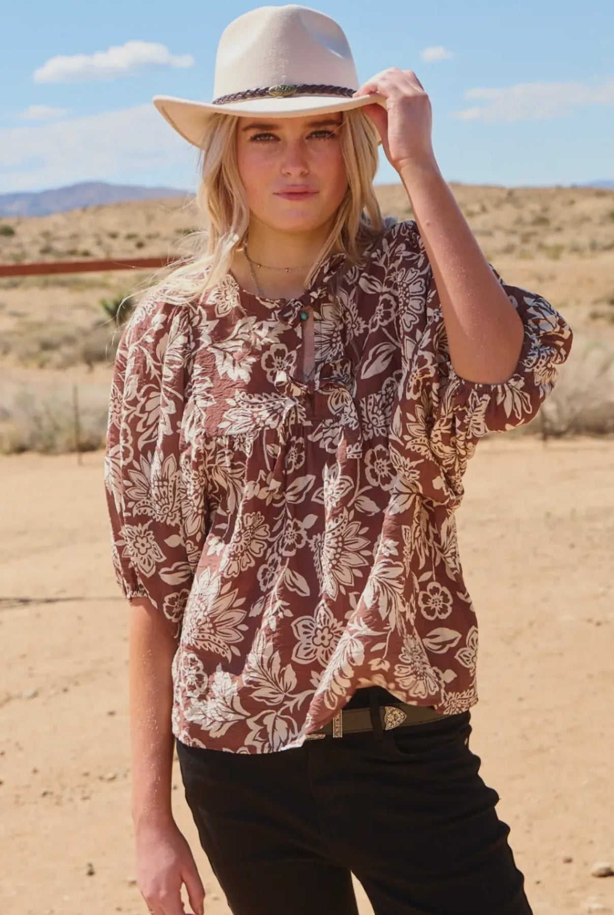 Boho printed 3/4" sleeve blouse with front tie ribbon neck. *** BROWN ***