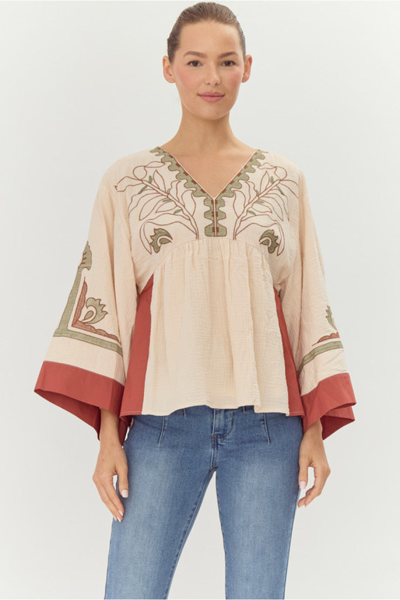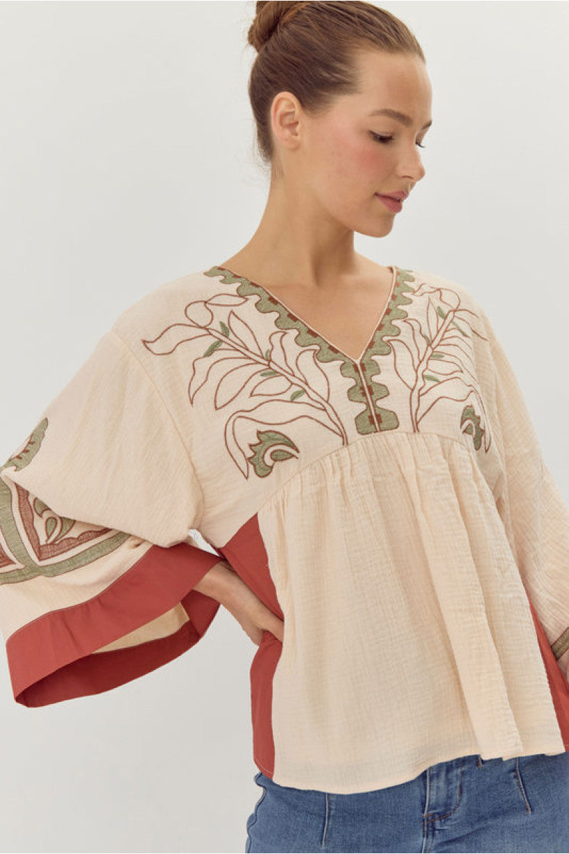 EMBROIDERY DETAILING COTTON GAUZE BABYDOLL WOVEN TOP