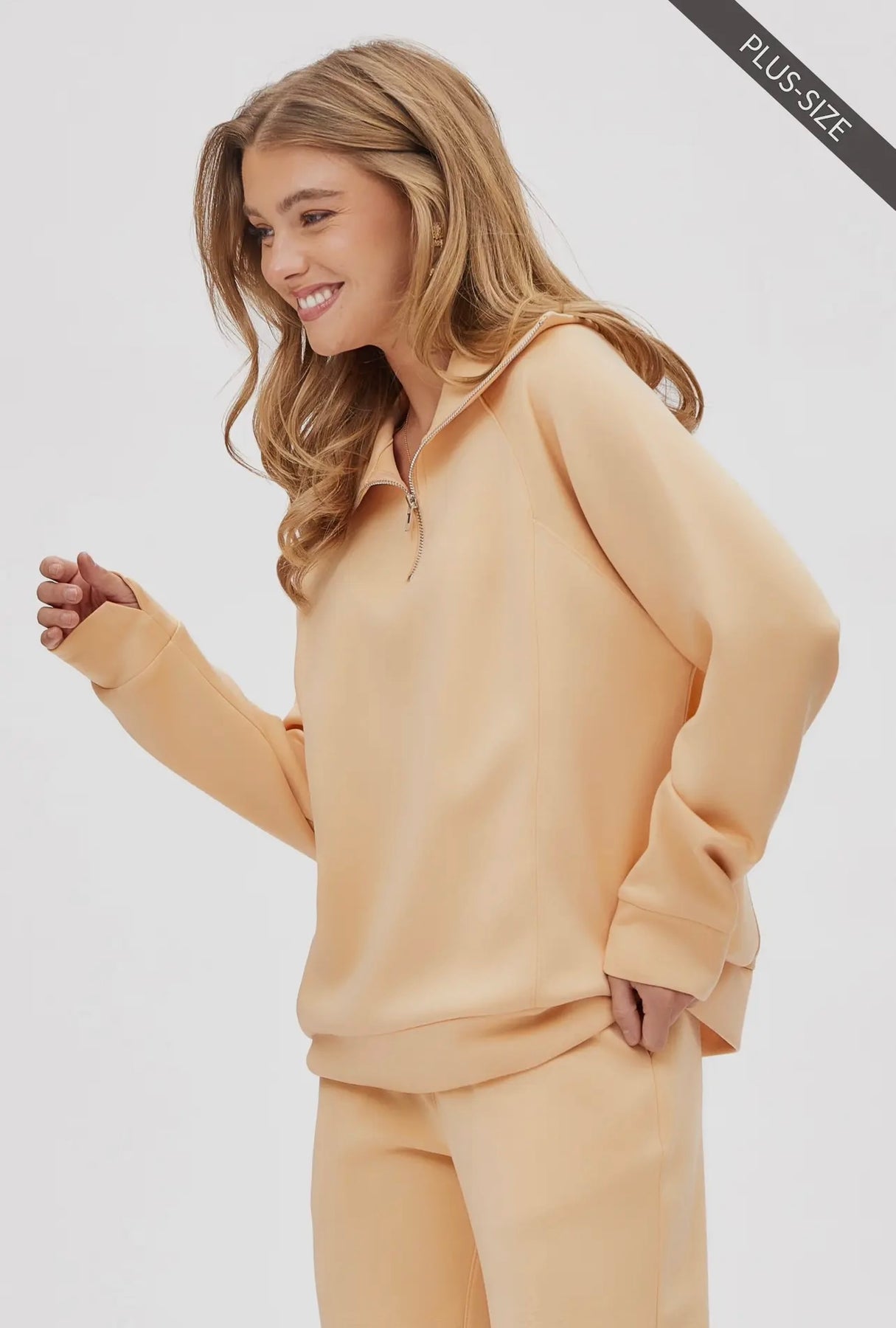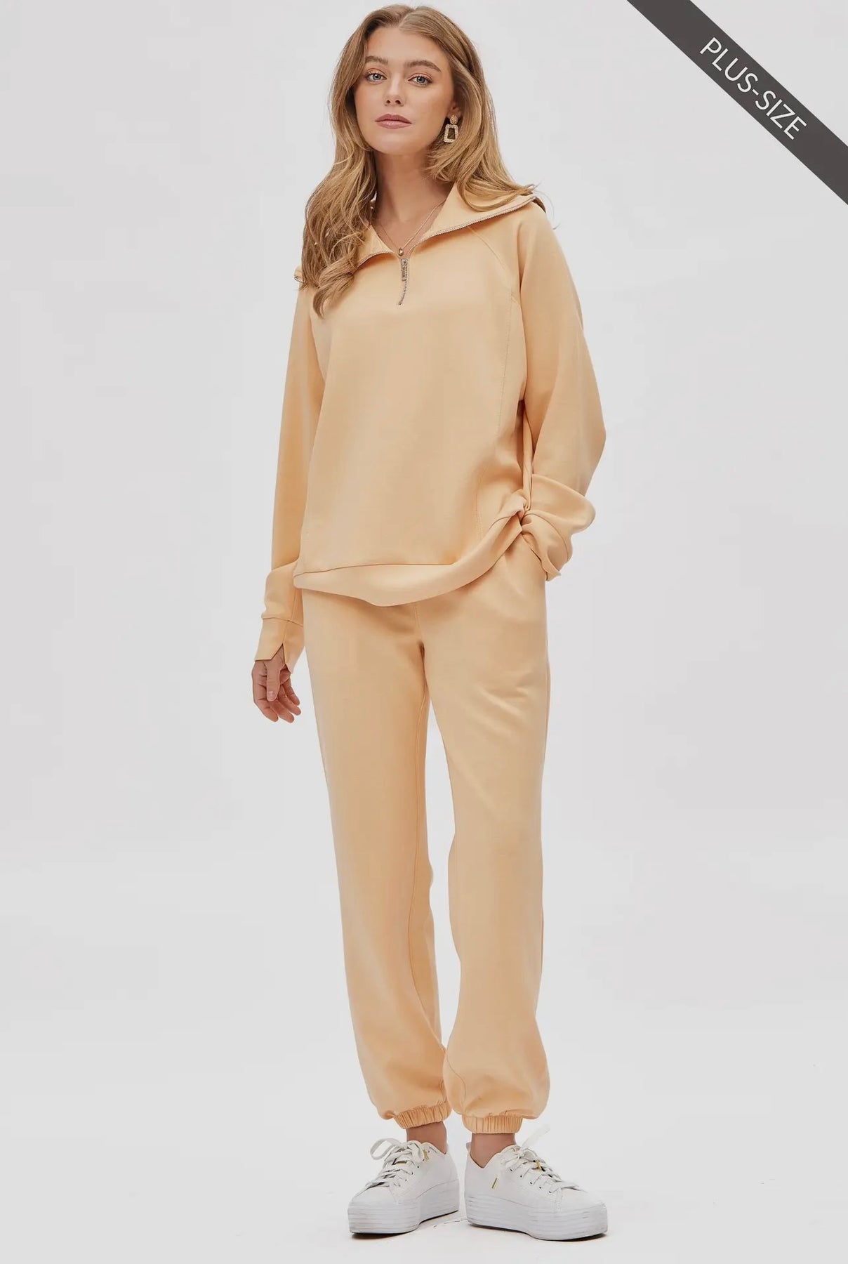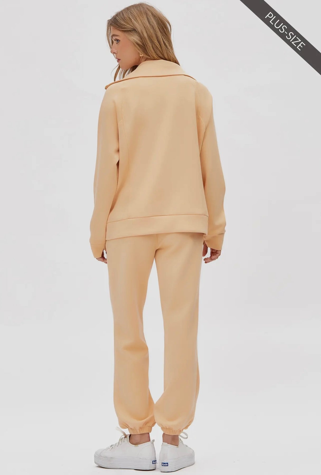 Hello to our halt zip up pull over with the softest modal fabric ever! We love the banded sleeves and hem with the easy, relaxed look on this top. This set also comes with a jogger pants that completes your perfect look! This is your favorite travel collection this season.