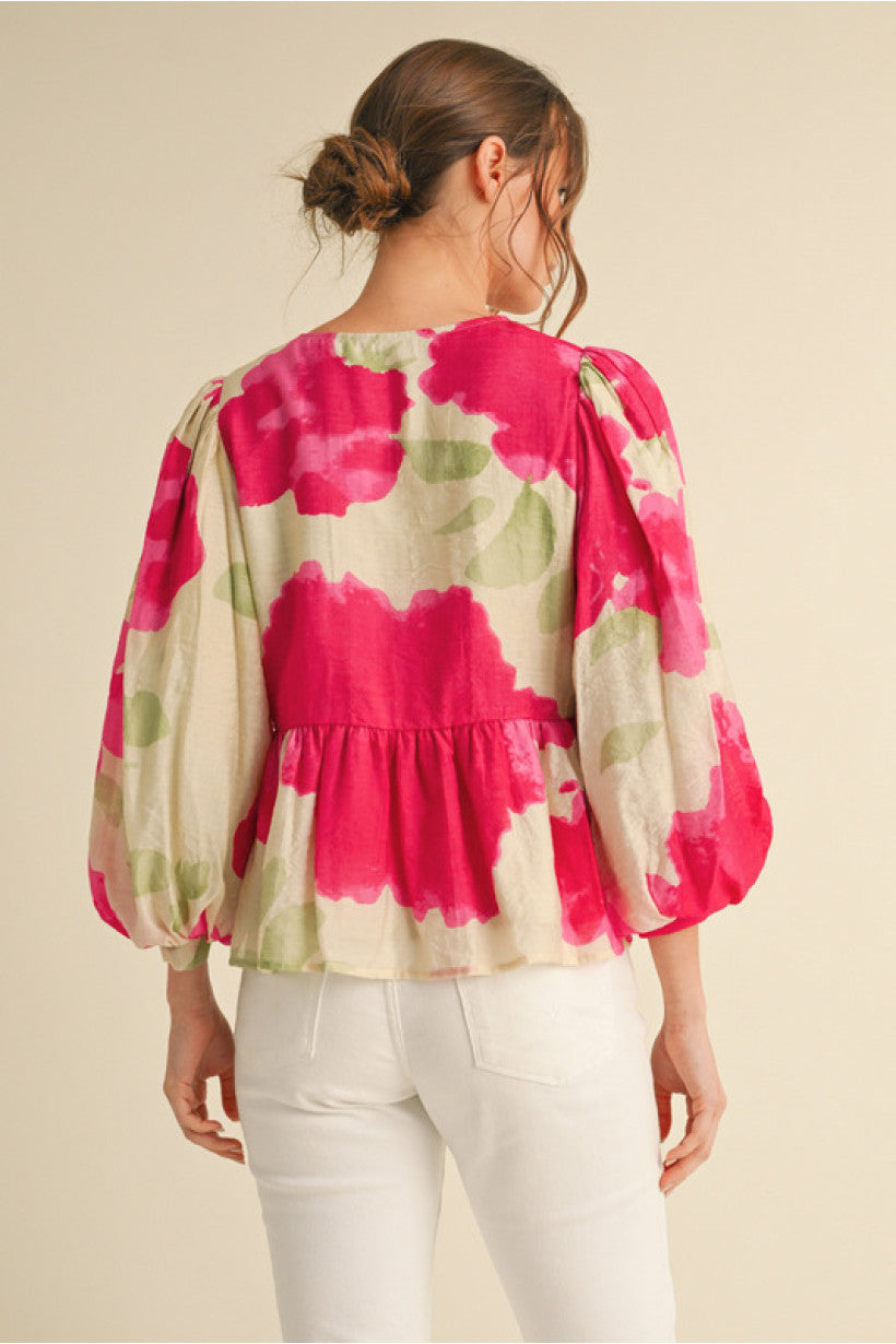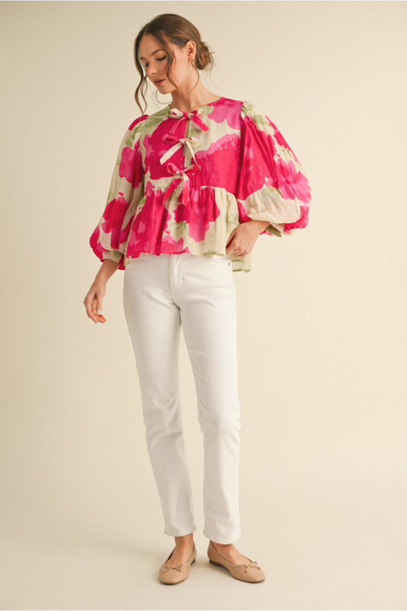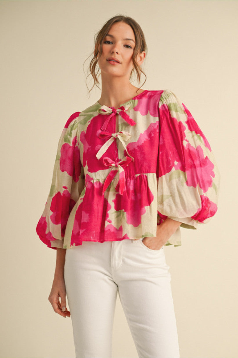 **Print bow ties peplum top with U-neck, three quarter balloon sleeves, and band cuffs.