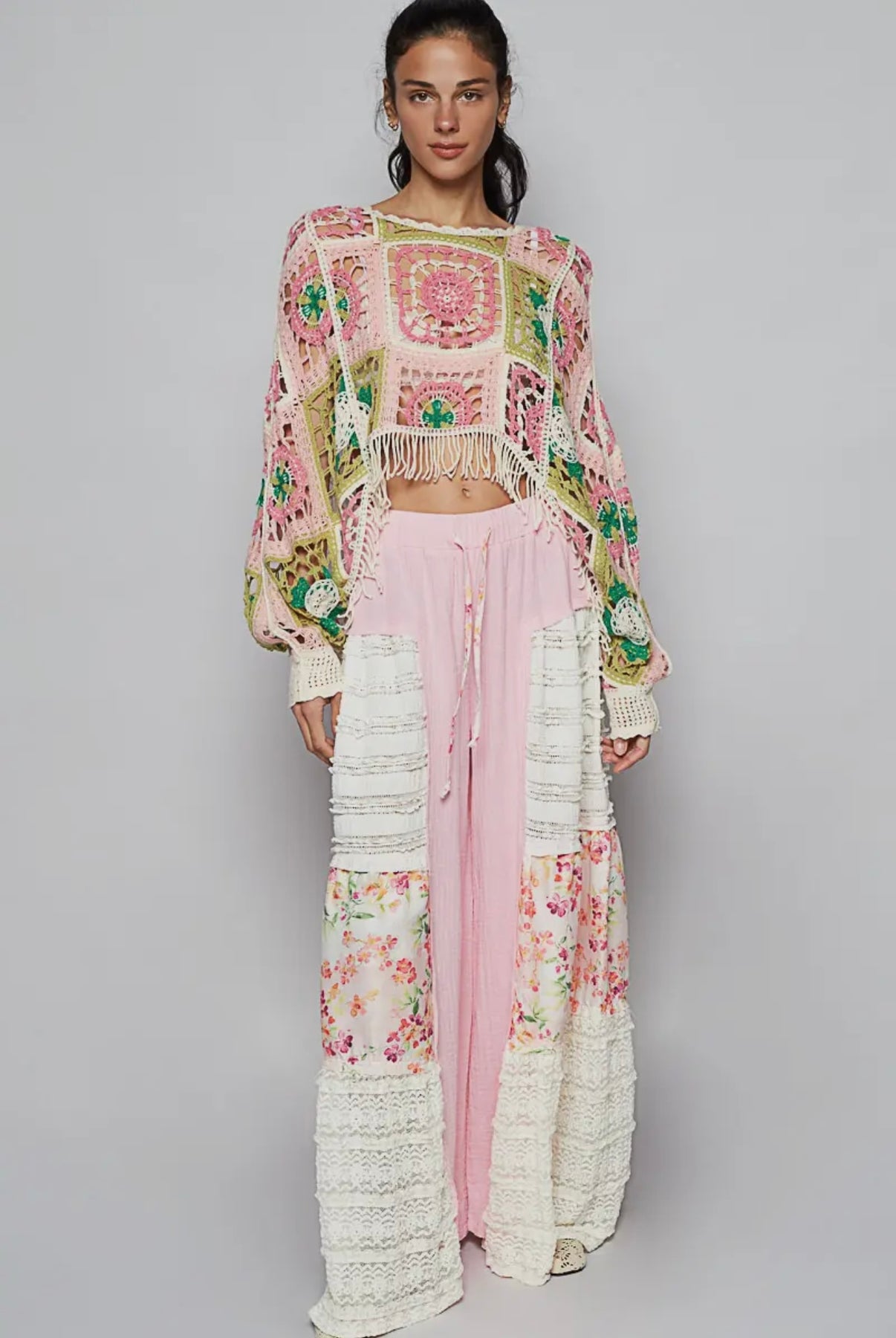 Designed with round neck, long sleeves and a cropped fit. Beautiful crochet with various woven knit patterns and fringe detailing. Poncho style to wear over cami or tank. Beautiful.