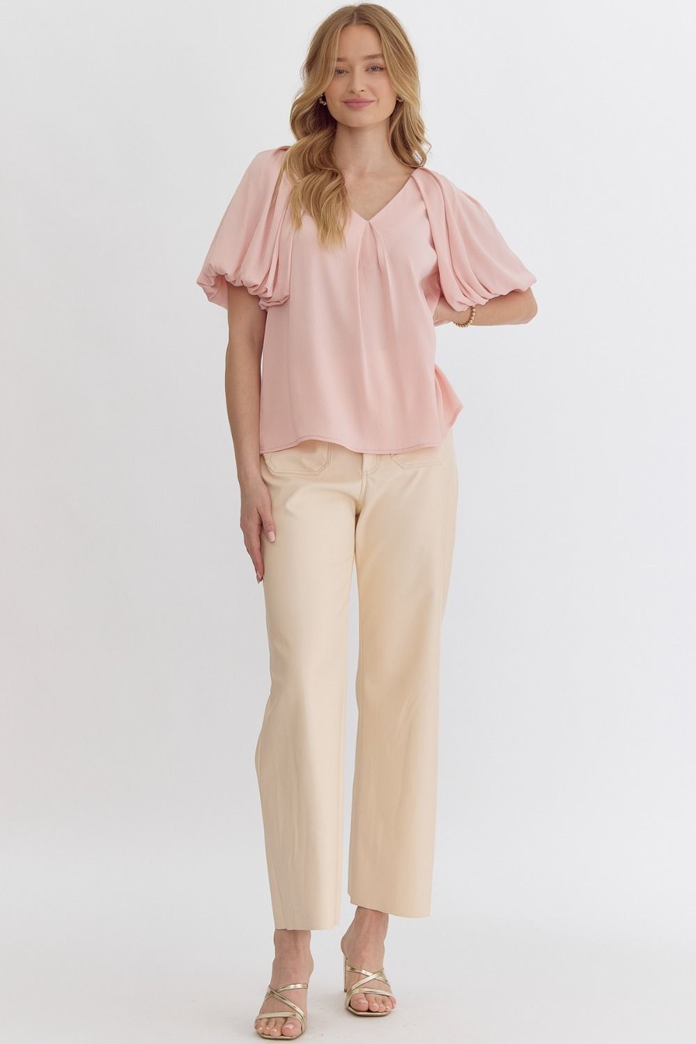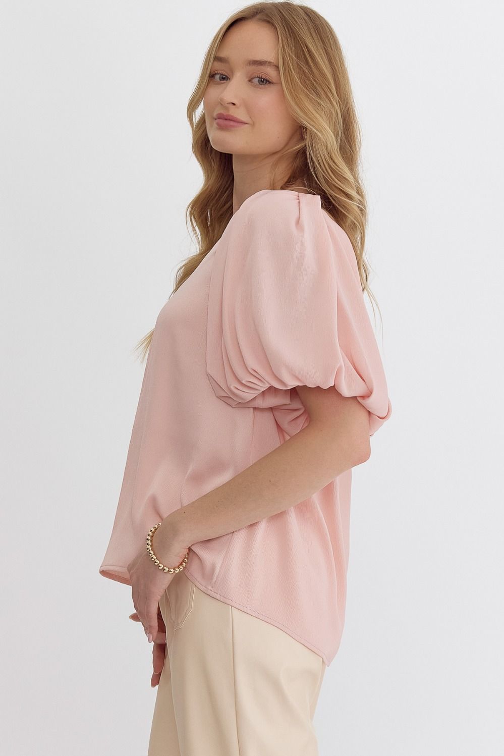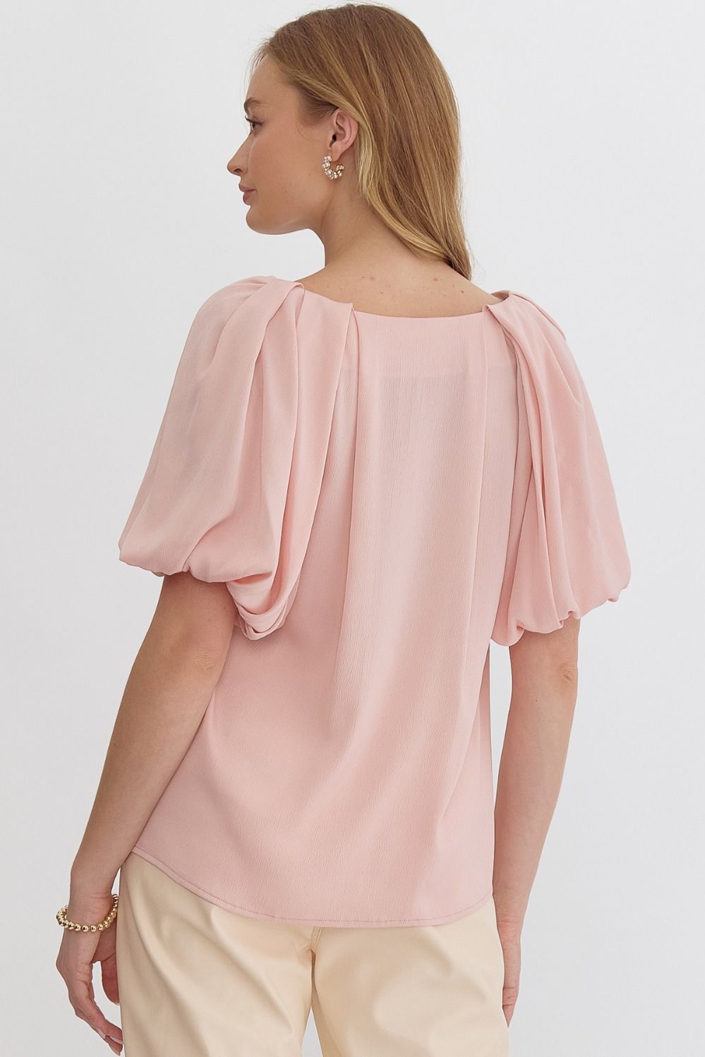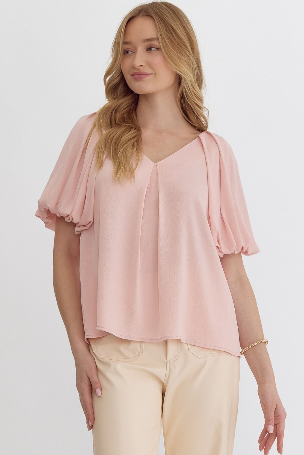 Solid satin v-neck bubble sleeve top featuring pleat details at front and back. Lined. Woven. Non-sheer. Lightweight.