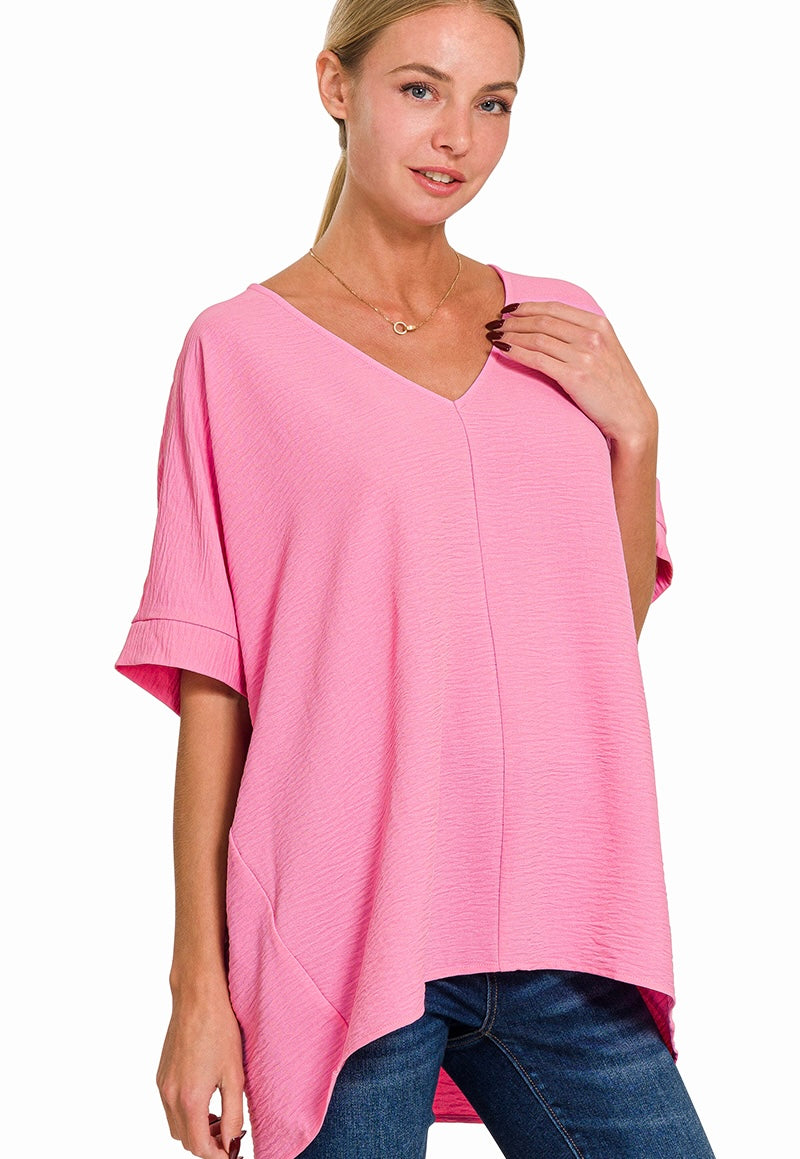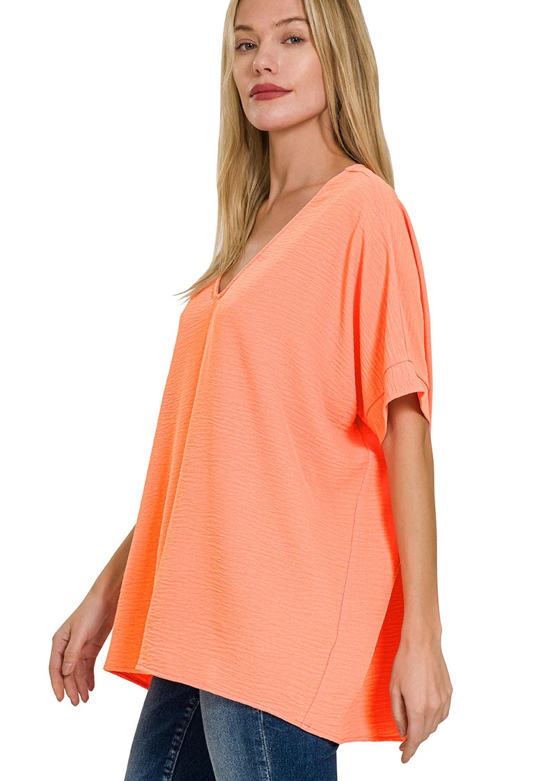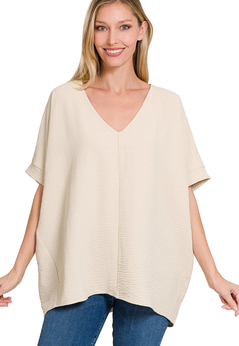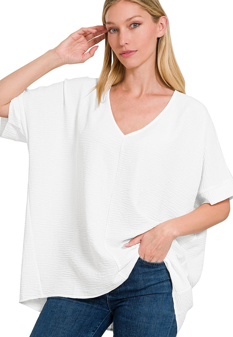 WOVEN AIRFLOW V-NECK SHORT SLEEVE TOP. OVERSIZED.