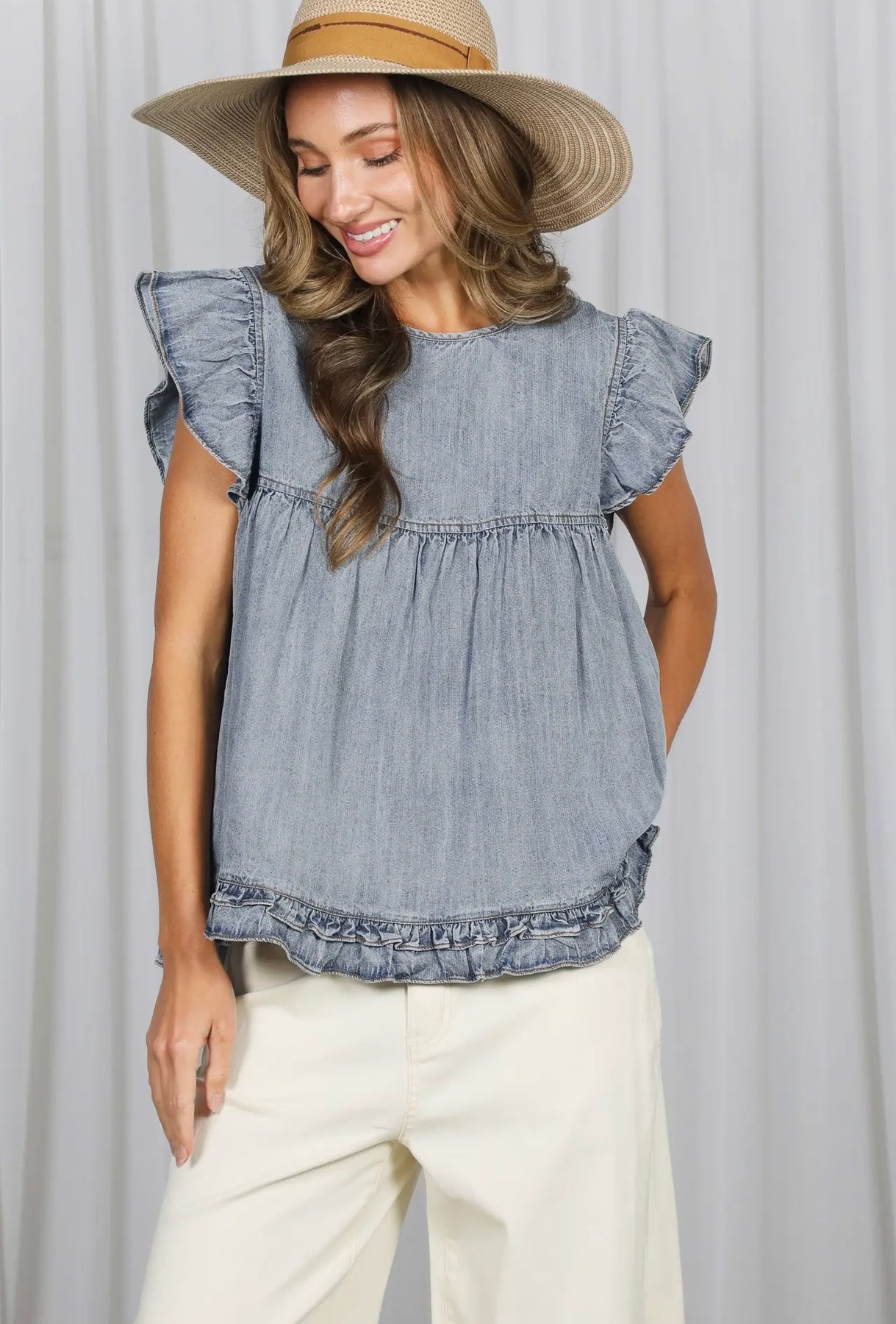 Short ruffle sleeve denim top for a soft, feminine look.