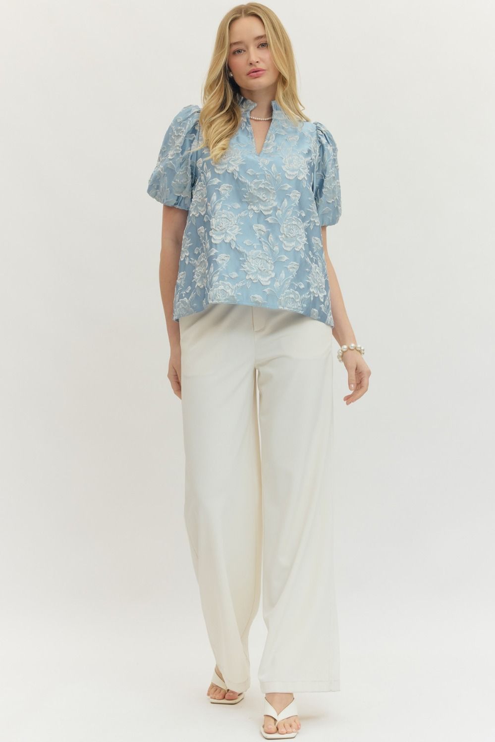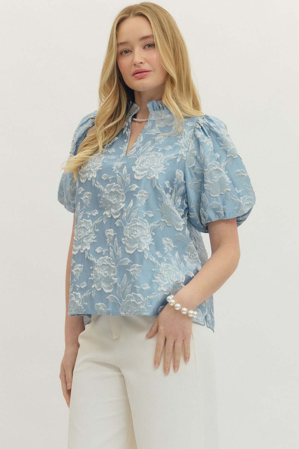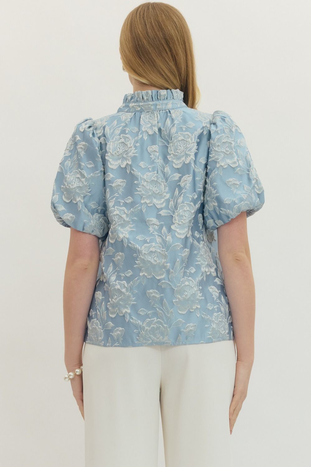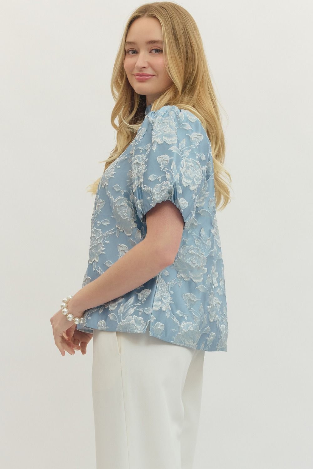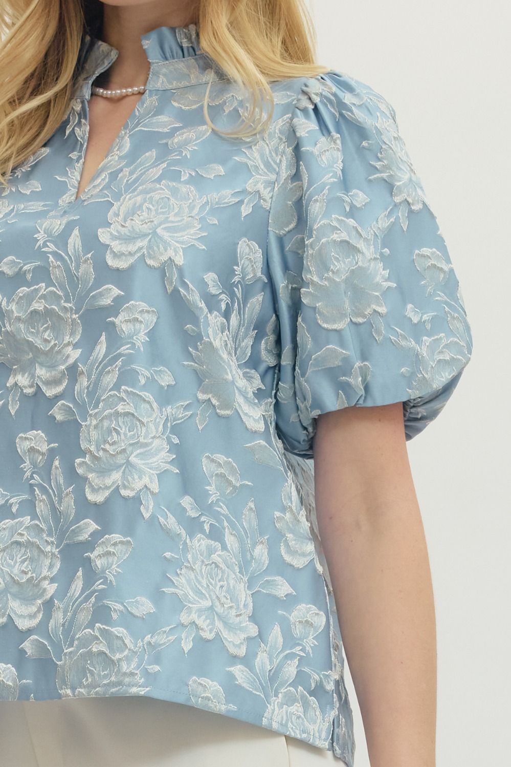 Floral jacquard short puff sleeve top featuring split V-neck with stand collar. Elasticated sleeve openings. Unlined. Woven. Non-sheer. Lightweight.