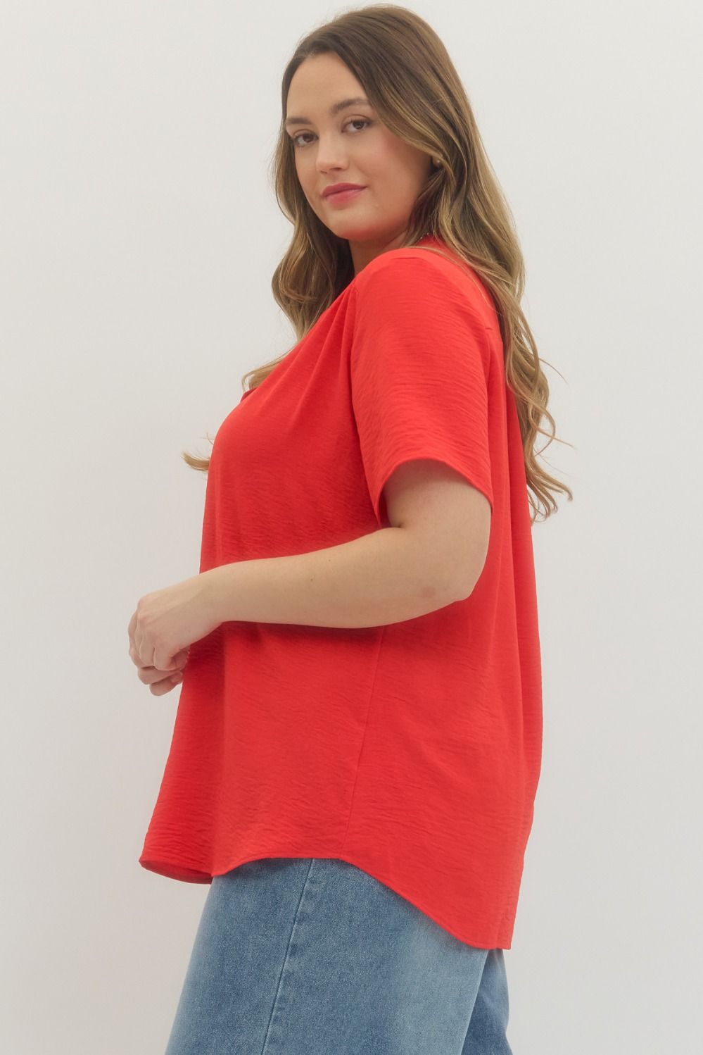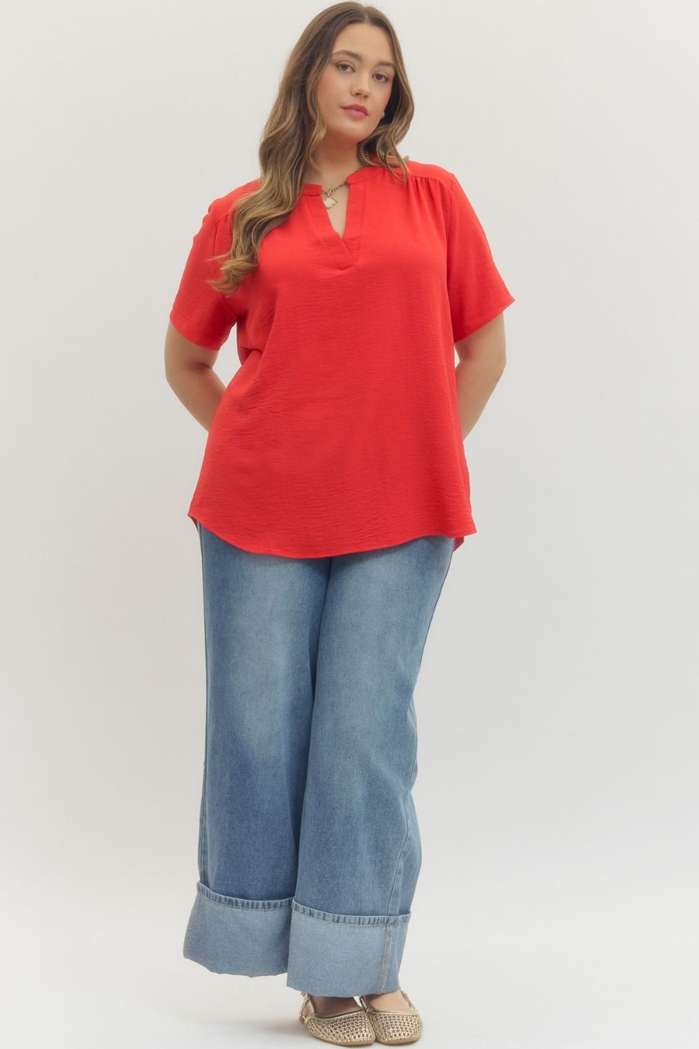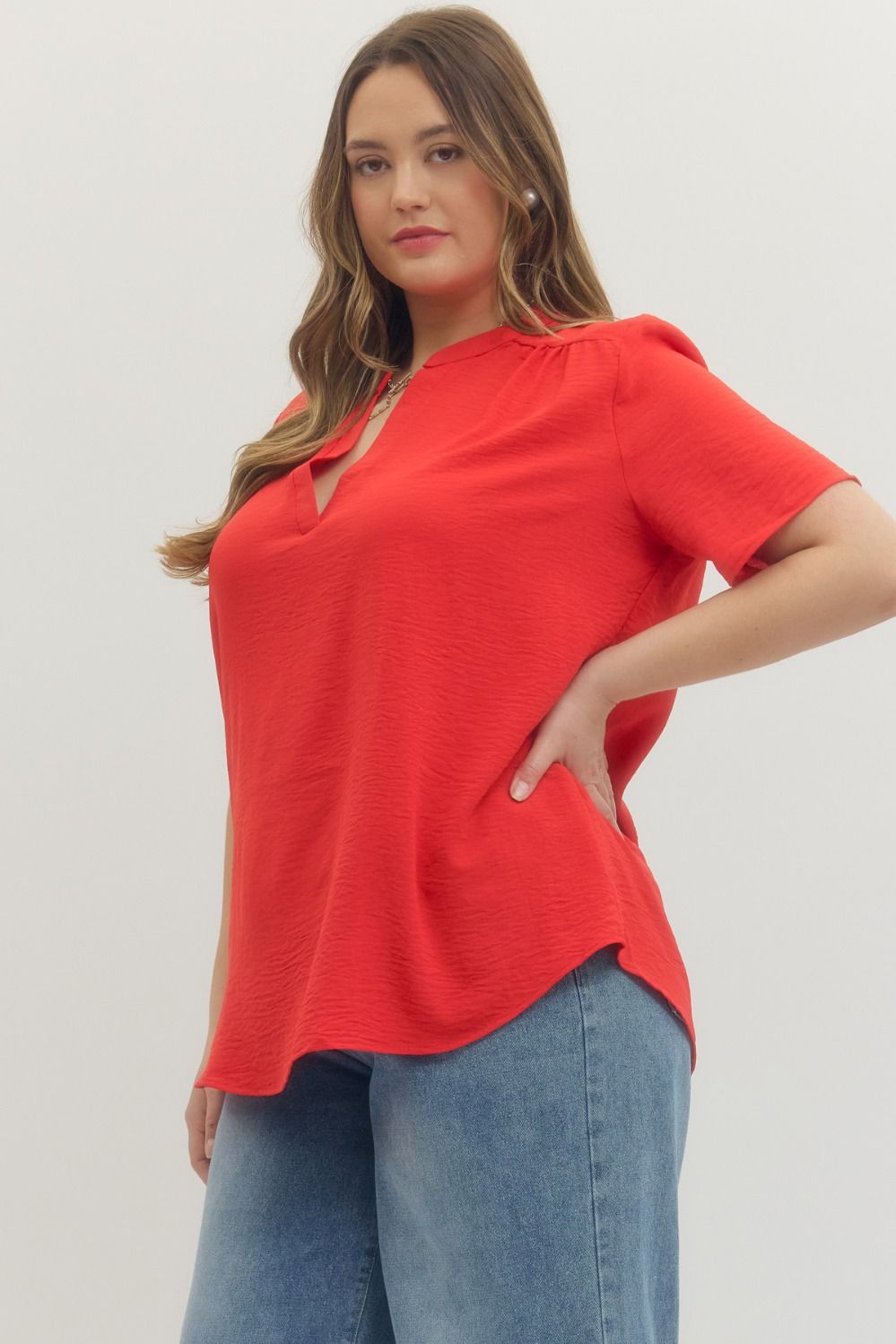 Solid v-neck placket top featuring gathered detail at shoulders. Unlined. Non-sheer. Woven. Lightweight.