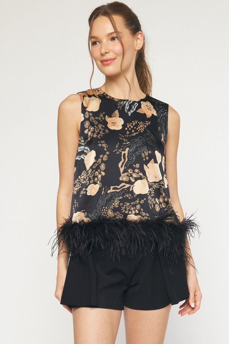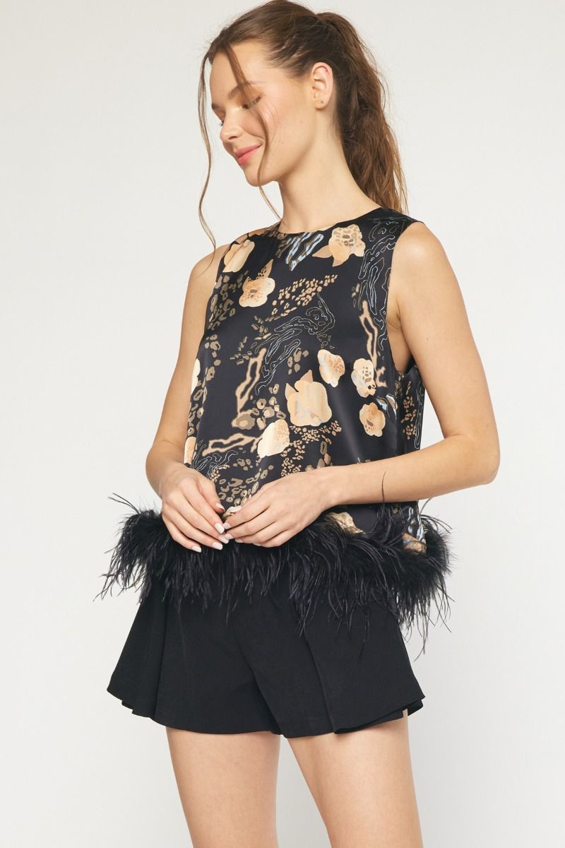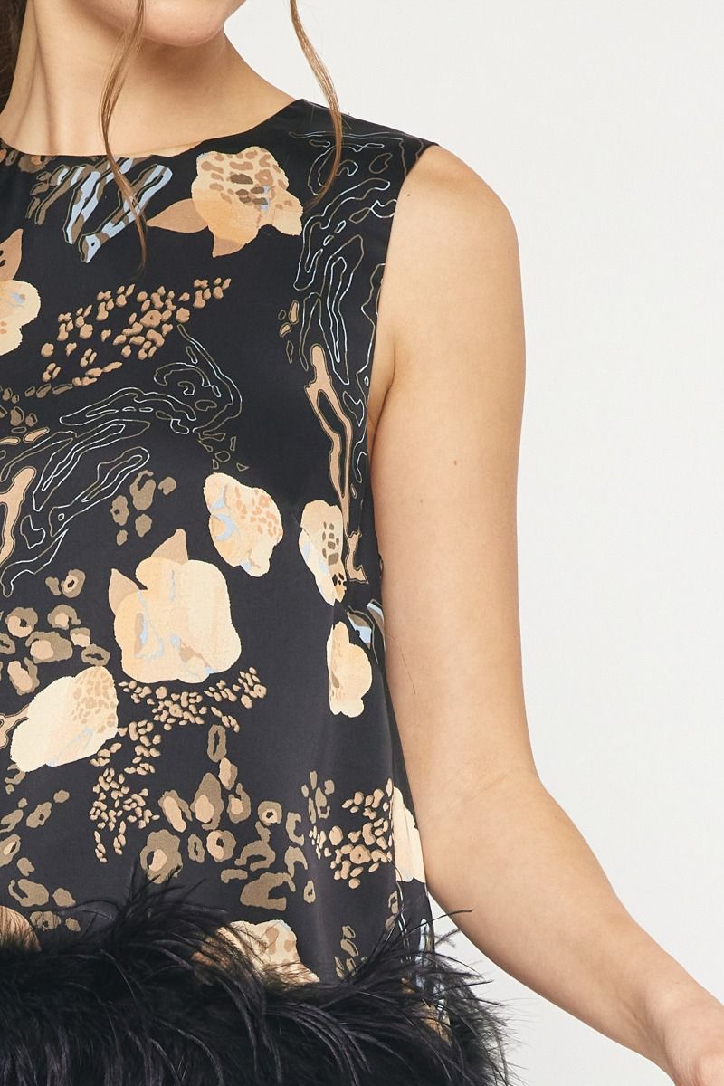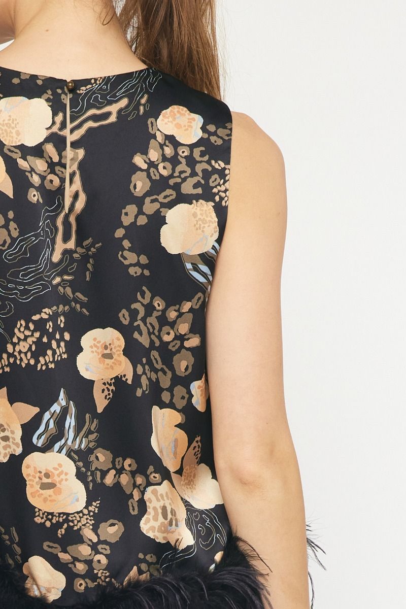 Print satin round neck spaghetti strap top featuring faux feather trim at hem. Keyhole button closure at back. Lined. Woven. Non-sheer. Lightweight. No stretch.