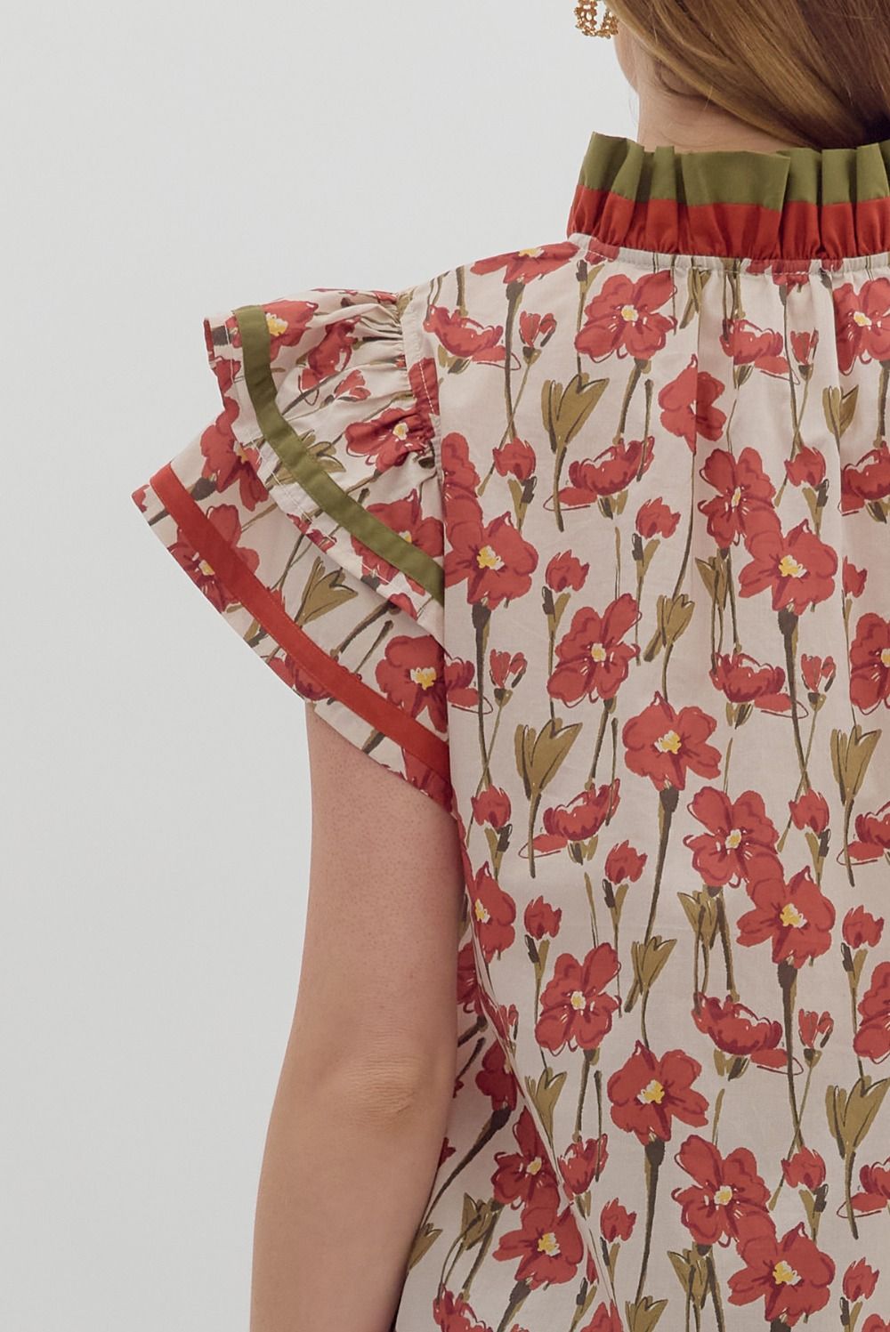 Floral print tiered flutter sleeve pullover top features multicolor accented ruffle neck and sleeve finish. Unlined. Woven. Non-sheer. Lightweight.