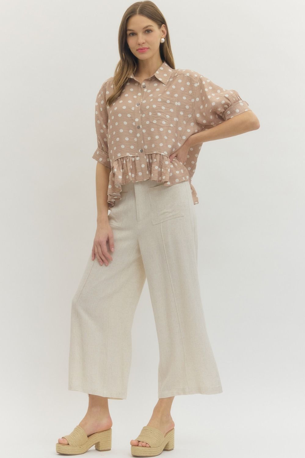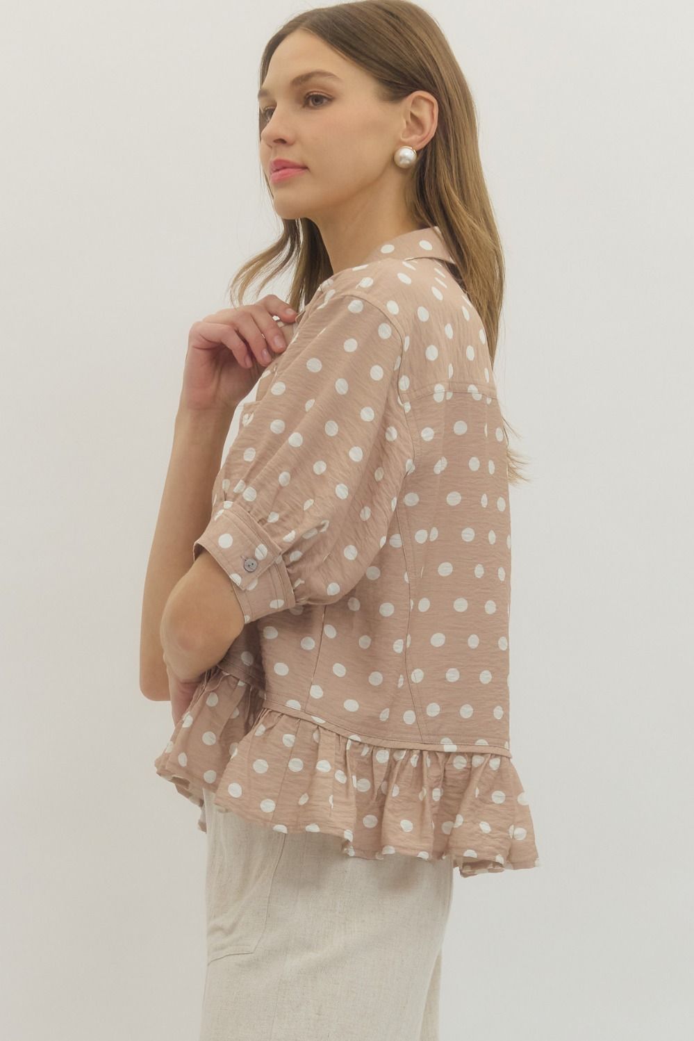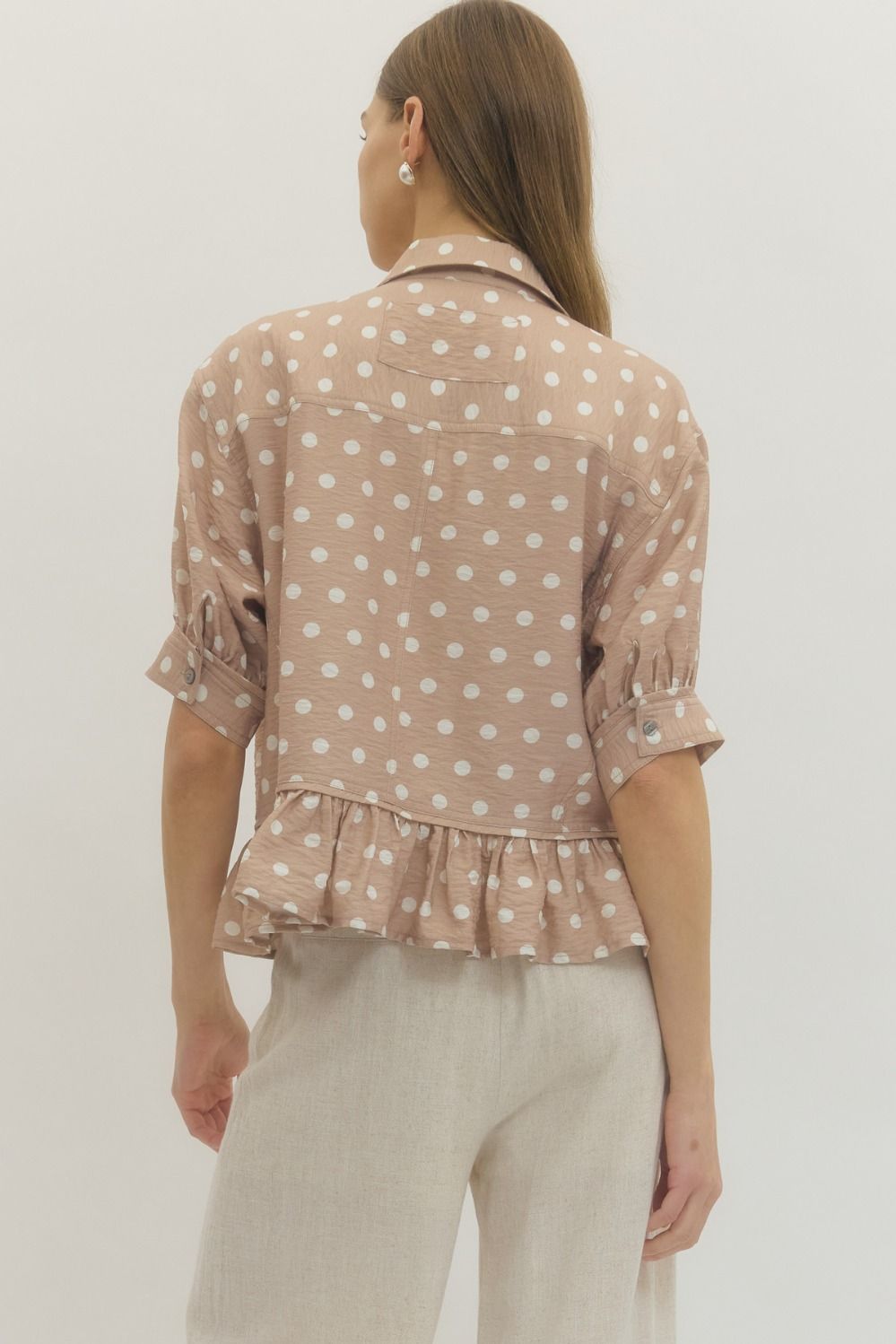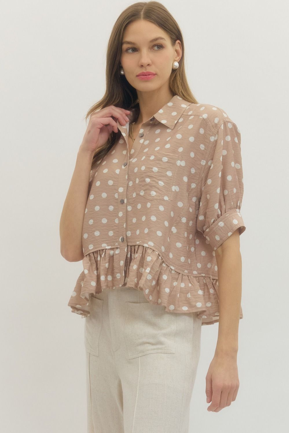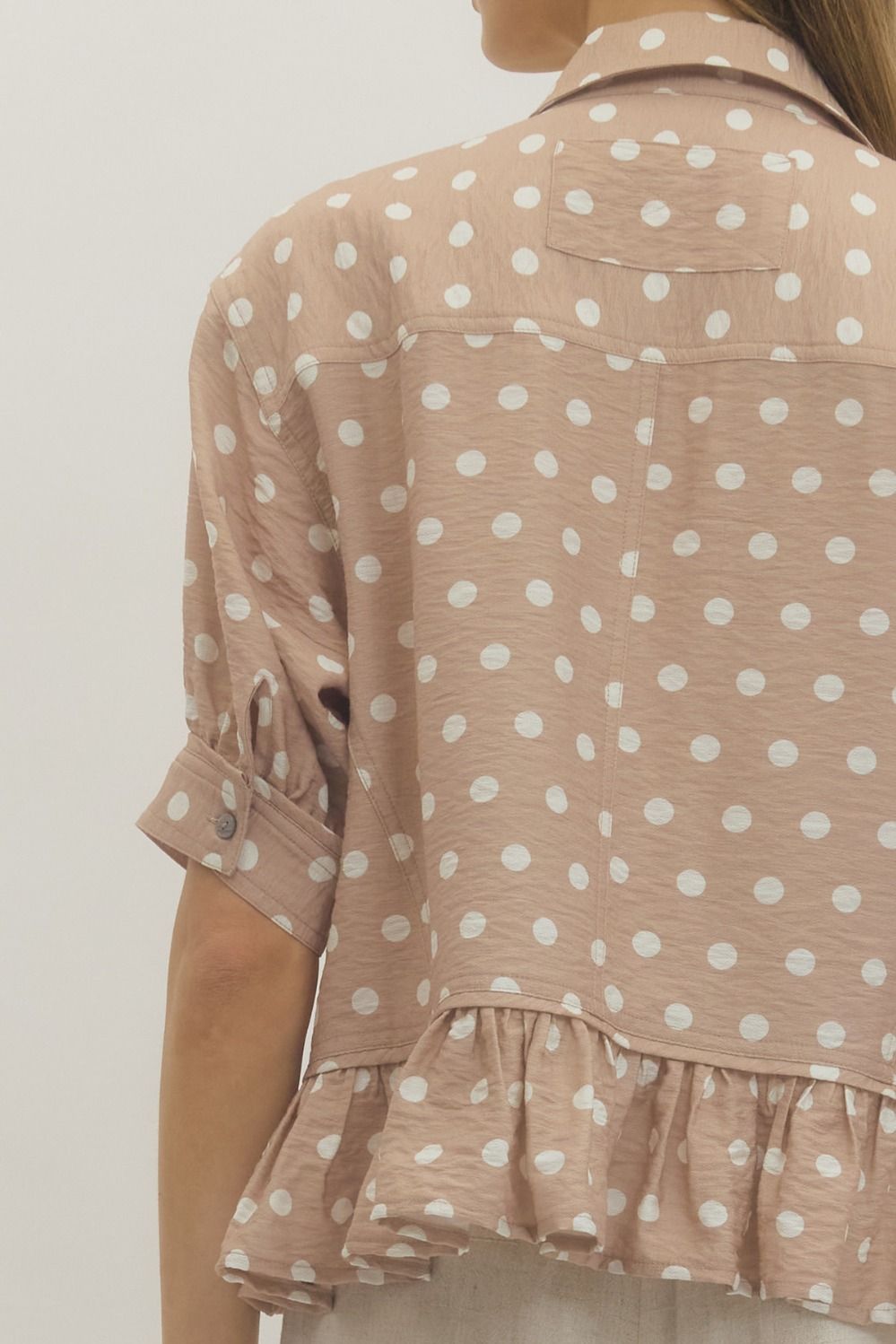 Polka dot short sleeve waist-length top featuring ruffle hem detail. Button closure at front. Sleeve tab with button detail. Unlined. Woven. Non-sheer. Lightweight.