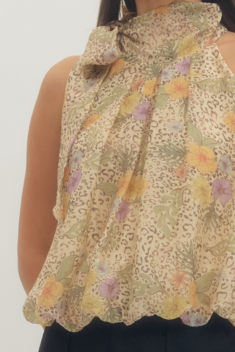 Floral and animal mixed print sleeveless halter top featuring self-tie at neck and softly gathered bubble hem. Lined. Woven. Non-sheer. Lightweight.