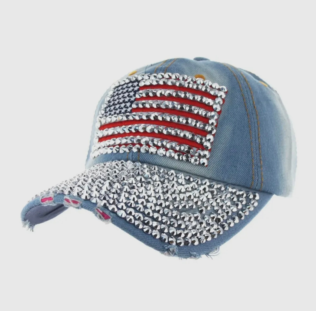 Show off your patriotism with our Rhinestone Denim Baseball Cap.